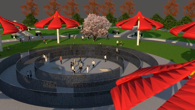 Proposed Park part 1: The design is a response to all the hardscape surfaces that were abandoned. Improvements start in the vegetation and morph into a place that people stay to enjoy. The inflatable blossom flower sculpture provides shade in a creative way as you sit underneath. In the center of the park, there's a lighting sculpture that makes itself visible and reveals written historical moments embedded in steel material.